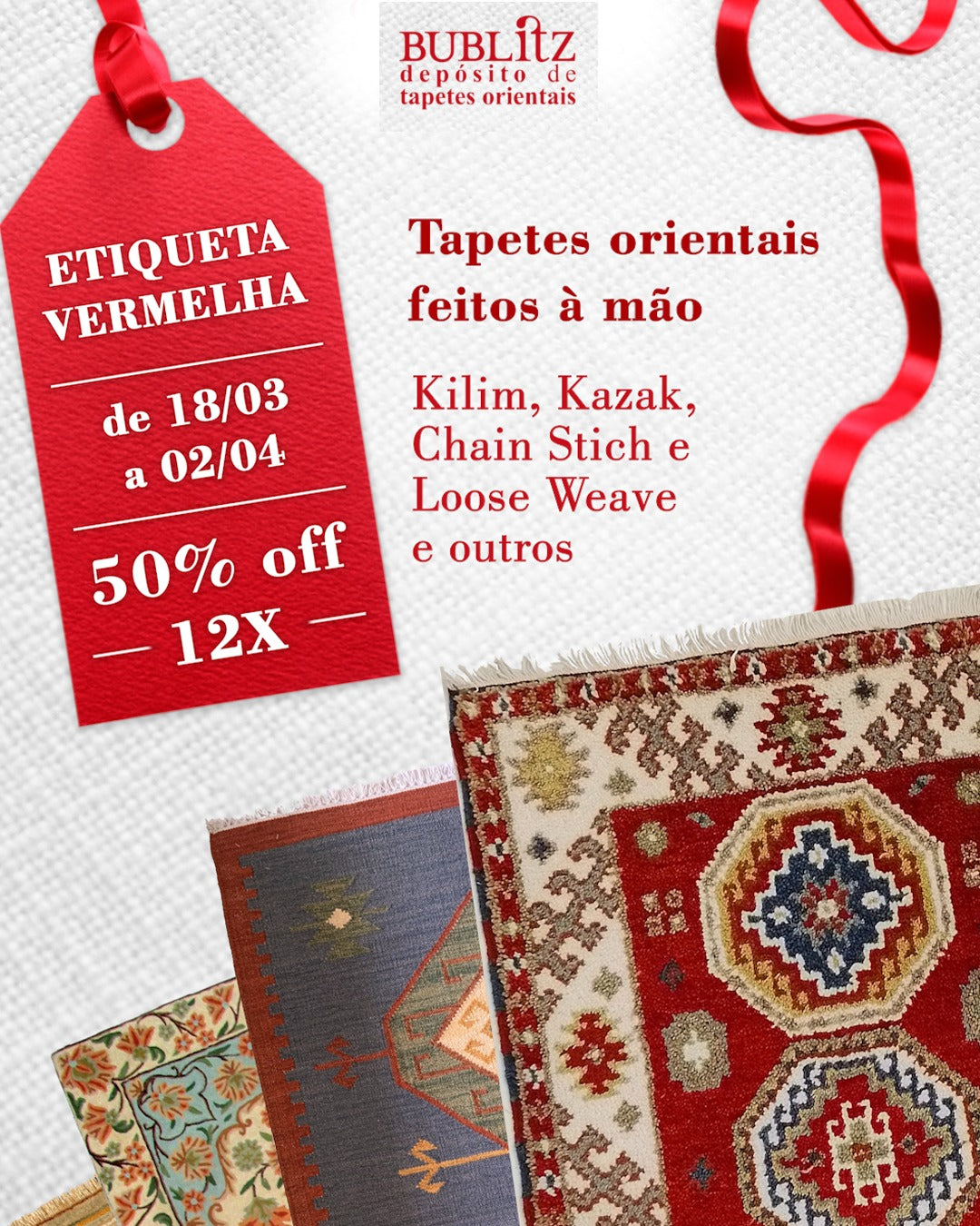 Tapetes importados do Irã, da Índia e do Paquistão, feitos à mão, nó por nó.